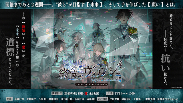 アイディアファクトリー株式会社(代表取締役社長:佐藤 嘉晃/所在地:東京都豊島区)の女性向けゲームブランド「オトメイト」は、朗読イベントシリーズ・オトメイトドラマティックシアターvol.03re「終遠のヴィルシュ -LyriC:memory-」が2週間後の【6月15日(日)】に開催されることをお知らせいたします。
