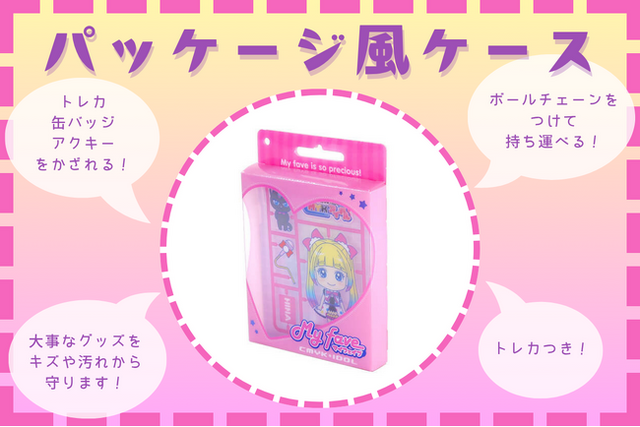 「パッケージ風ケース」は、付属のトレカはもちろん、お手持ちの缶バッジやアクリルキーホルダーなども入るサイズ。お気に入りのグッズをキズや汚れから守りつつ、可愛く飾れるのがポイントだ。