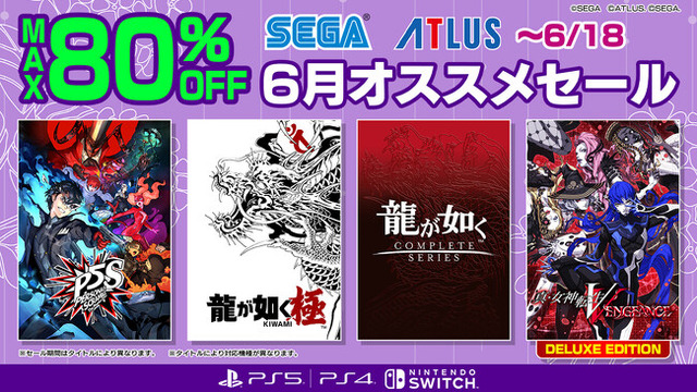 株式会社セガは、PlayStation(TM)Storeおよびニンテンドーeショップにて販売中の一部PlayStation(R)5/PlayStation(R)4/Nintendo Switch(TM)用タイトルを対象とし、期間限定で特別価格にて販売する「セガ 6月オススメセール」を開催中です。