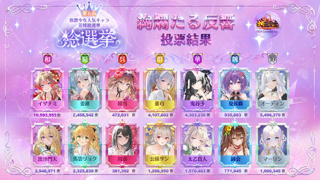 C4 Connect株式会社(本社:東京都渋谷区)は、現在サービス中の美少女RPGゲーム『放置少女~百花繚乱の萌姫たち~』(スマートフォンアプリ及びブラウザ版)(以下、『放置少女』)にて開催中の「第五回放置少女人気キャラ総選挙」段階2.『絢爛たる反響』の投票結果を発表いたします。