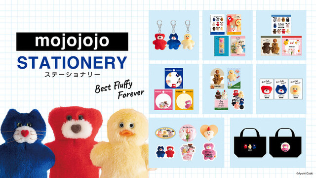 今回新発売するステーショナリーは、スクエアメモ、付箋、B6リングノート、ブックマーカー、ダイカットステッカー、アクリルクリップ、アクリルキーホルダー、ランチトートの8アイテム(全28種)です。「mojojojo」作品の中でも人気が高い定番のぬいぐるみをデザインし、「mojojojoらしさ」のある明るいカラーに仕上げました。