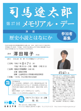 郵便番号、住所、氏名(ふりがな)、電話番号、および「第27回司馬遼太郎メモリアル・デー参加希望」を記入して、往復はがき・姫路文学館ホームページ内の申請フォーム(いずれの場合も1申込につき1人まで)で、姫路文学館(〒670-0021、姫路市山野井町84番地)まで。電話、ファクシミリでの申し込みは不可。