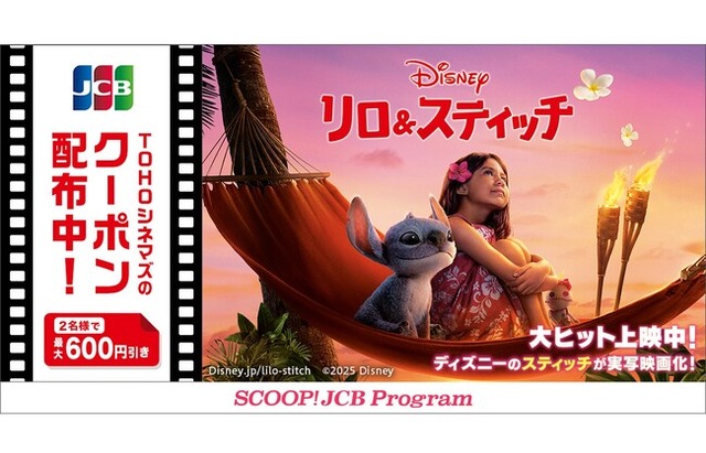 株式会社ジェーシービー(本社:東京都港区、代表取締役兼執行役員社長:二重 孝好、以下:JCB)は、TOHOシネマズ株式会社(本社:東京都千代田区、代表取締役社長:池田 隆之、以下:TOHOシネマズ)と、2025年6月6日(金)から7月3日(木)まで、ディズニー映画最新作『リロ&スティッチ』の公開を記念して本作をお得に鑑賞いただけるクーポンを配布します。
