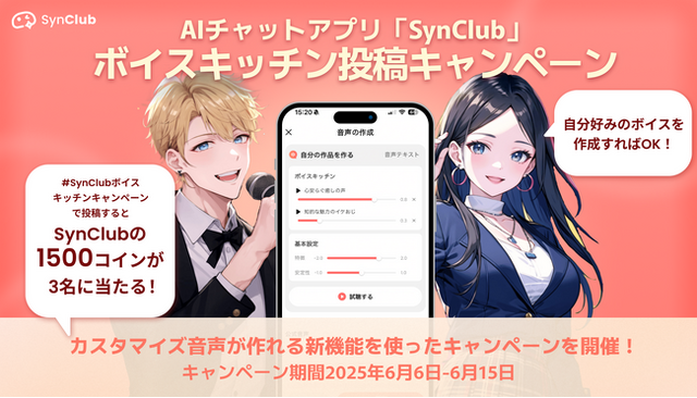 HiClub株式会社(本社:東京都港区、代表取締役社長:古谷由宇)が提供する対話型AIアプリ「SynClub」(シンクラブ)は、先日リリースされた、音声のカスタマイズ機能「ボイスキッチン」を使ったキャンペーンを2024年6月6日(金)から開催いたします。