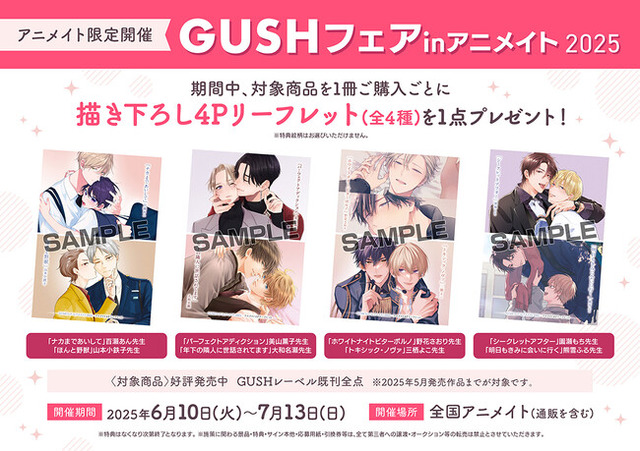 全国アニメイト・アニメイト通販で6月10日~7月13日まで開催する「GUSHフェアinアニメイト2025」では、2025年5月までに発売された「GUSH」レーベルの書籍をご購入1冊ごとに、特典「描き下ろし4Pリーフレット(全4種)」を1冊プレゼントいたします。