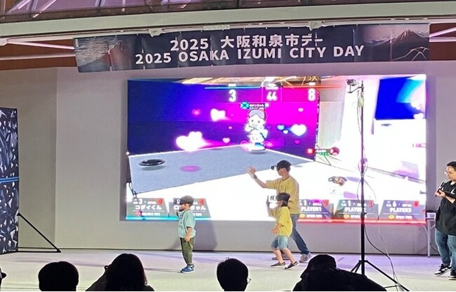 当日開催された大阪府和泉市の魅力を世界に発信する「2025大阪和泉市デー」に引き続き、同ステージにて和泉市とコラボして、和泉市のイメージキャラクター コダイくん・ロマンちゃんを「HADO」内に出現させ、ハートの弾を送り合うオリジナルコンテンツを展開しました。ご家族連れや友人同士など、みなさんが実際に体験し、プレイの様子はステージ上の大型ビジョンに映し出され、観客からも声援が飛び交いました。