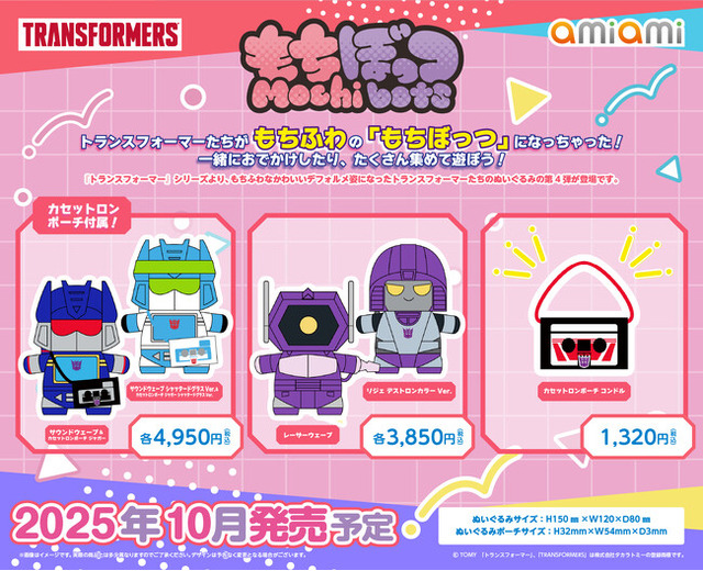 フィギュア&ホビー通販大手の「あみあみ」を運営する、大網株式会社(本社・東京都文京区)は、変形ロボットキャラクター『トランスフォーマー』(発売元:タカラトミー)のぬいぐるみ「もちぼっつ トランスフォーマー ぬいぐるみ」の第4弾を、2025年10月予定で発売いたします。