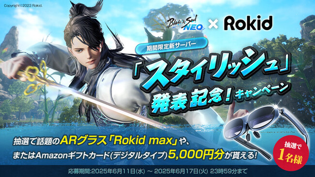 エヌ・シー・ジャパン株式会社(本社:東京都港区、代表取締役:林 元基(イム ウォンキ)、以下エヌシージャパン)は、PCオンラインゲーム『ブレイドアンドソウル』のリメイク作品となる『ブレイドアンドソウルNEO』にて、期間限定新サーバー「スタイリッシュ」の発表を記念し、Rokid Japanとのコラボキャンペーンを開催中です。