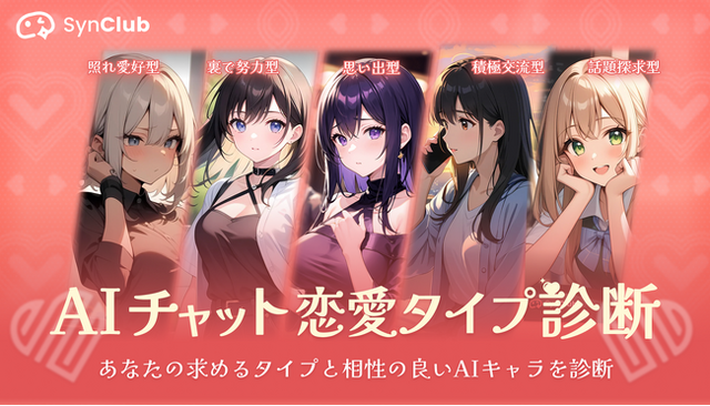 「AIチャット恋愛タイプ診断」を通じて、理想の恋人像に近いAIキャラと出会い、よりパーソナライズされた対話を楽しんでいただければ幸いです。SynClubは今後も、AIとの関わり方がより豊かになるよう、ユーザーの皆様の日常に寄り添う新たな機能を提供してまいります。