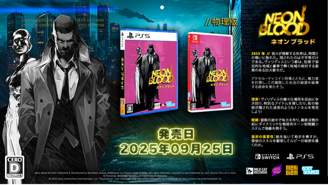 Neon Blood (C) 2025. Published & Distributed by Meridiem Games. Developed by Chaotic Brain Studios. All rights reserved. Licensed to and Physical Published by Soft Source Pte Ltd in ASIA.