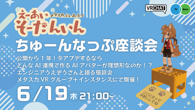 ◆日時:令和7年6月19日(木曜日)21:00~23:00(予定)◆会場:VRChat MyDearest バーチャルオフィス