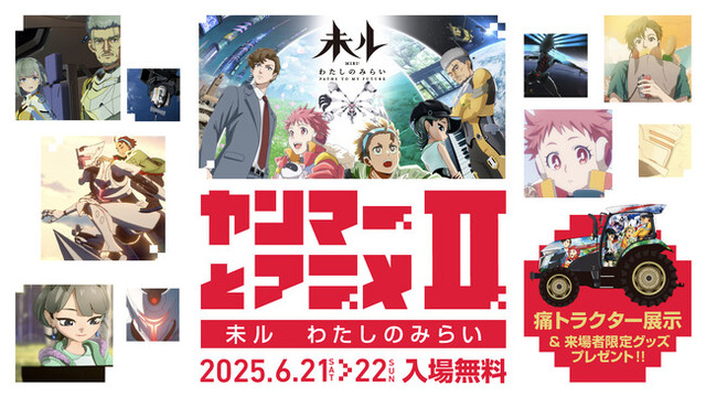 「ヤンマーとアニメII - 未ル わたしのみらい -」では、今年春にMBSで放映され話題となった、当社製作・プロデュースのオリジナルTVアニメ『未ル わたしのみらい』(以下、『未ル』)のパネル展示のほか、「AnimeJapan2025」に登場した「痛トラクター」の展示を行います。「痛トラクター」には、ヤンマーのトラクターの車体に『未ル』のキャラクターを描いており、写真撮影もしていただけます。また、会場ではオリジナルグッズがもらえるキャンペーンやヤン坊マー坊とのグリーティングイベントも開催予定です。