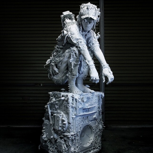 大野は、音楽カルチャーの視点を取り入れたアプローチを基軸に、内面から湧き上がる「衝動」を創作の原動力とし、プラスチックや金属片、使えなくなった楽器など、日常にあふれる様々な人工的な素材を用いて、寄せ集めて新たな形を造形する手法「ブリコラージュ」による作品を制作しています。