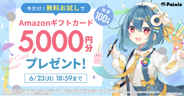 株式会社パルミー(所在地:東京都港区、代表取締役:大野英紀、以下パルミー)は、本日2025年6月13日(金)12時00分~2025年6月23日(月)18時59分までの期間、パルミーの無料お試しをご利用いただいた方の中から抽選100名様にAmazonギフトカードをプレゼントするキャンペーンを開催いたします。