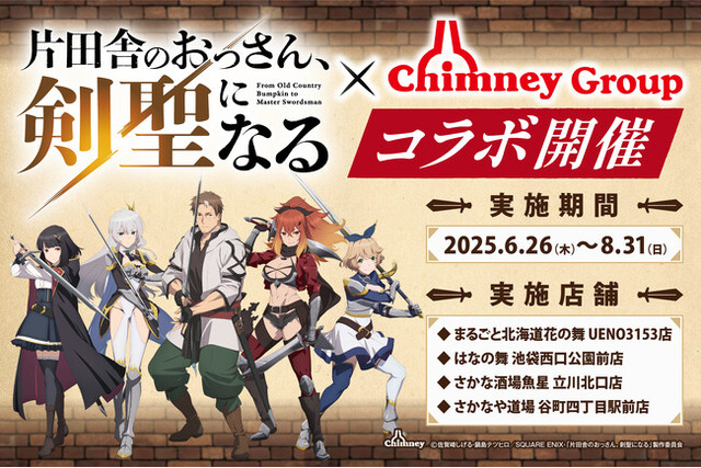 海鮮居酒屋「はなの舞」「さかなや道場」を全国展開するチムニー株式会社(東京都墨田区)は2025年6月26日(木)より「まるごと北海道 花の舞 UENO3153店」「はなの舞 池袋西口公園前店」「さかな酒場 魚星 立川北口店」「さかなや道場 谷町四丁目駅前店」の4店舗にて、TVアニメ『片田舎のおっさん、剣聖になる』とのコラボレーションキャンペーンを開催いたします。