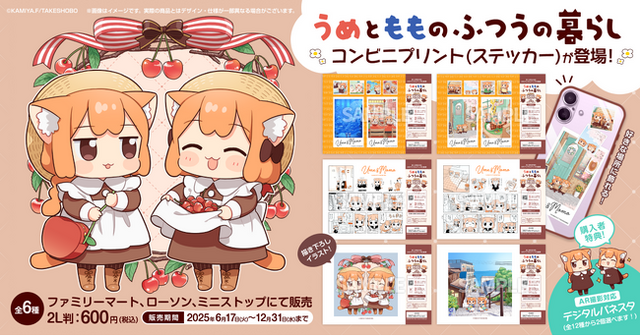 ストーリアダッシュ(竹書房)連載中『うめともものふつうの暮らし』の10巻発売を記念して、全国の各コンビニエンスストアのマルチコピー機にてプリント全6種をステッカー形式で販売。