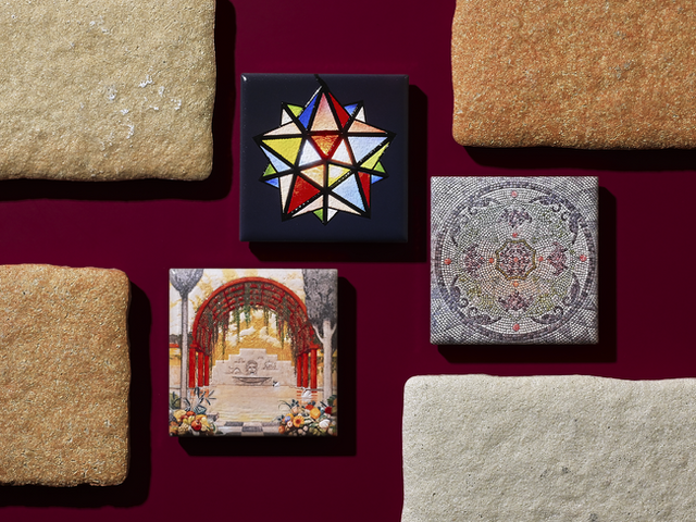 東京都庭園美術館のシンボルである正面玄関のガラスレリーフ扉の前には、小さな大理石がモザイク状に配されています。自然石の細かなピースが織りなす幾何学模様のフレームを1本1本丁寧に描き出し、時間帯や天候によって変化する深みのある色合いと、天然石ならではの表情豊かな質感を、実物に近い形で再現しました。永遠の一瞬をとらえたかのような、神秘的な作品と出会ったときの感動を、指先からそっと呼び覚ますアイテムです。