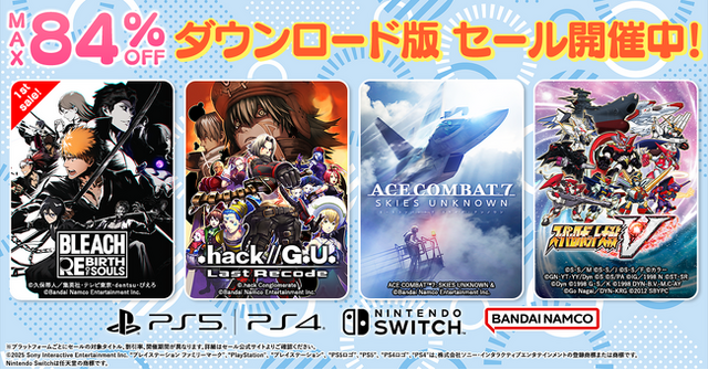 株式会社バンダイナムコエンターテインメントは、ダウンロード版ゲームをお得に購入可能なセールの開催をお知らせいたします。『ACE COMBAT(TM)7: SKIES UNKNOWN』や『スーパーロボット大戦V』など、人気タイトルが特別価格で登場します。さらに『BLEACH Rebirth of Souls』がセールラインナップに初登場!