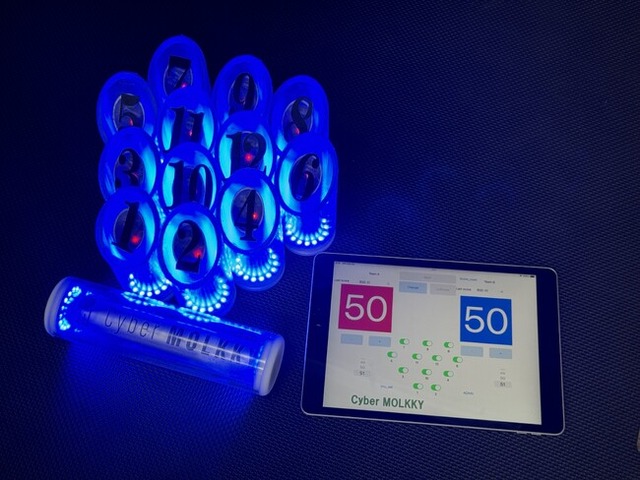 サイバーモルックは、フィンランド発祥のピン倒しスポーツ「モルック」を、現代のデジタル技術で進化させた次世代ニュースポーツです。対象となる12本のスキットル(倒すピン)と、投擲用のピンすべてにセンサーとLEDを内蔵し、完全自動判定・即時スコア計算・演出連動を実現しています。