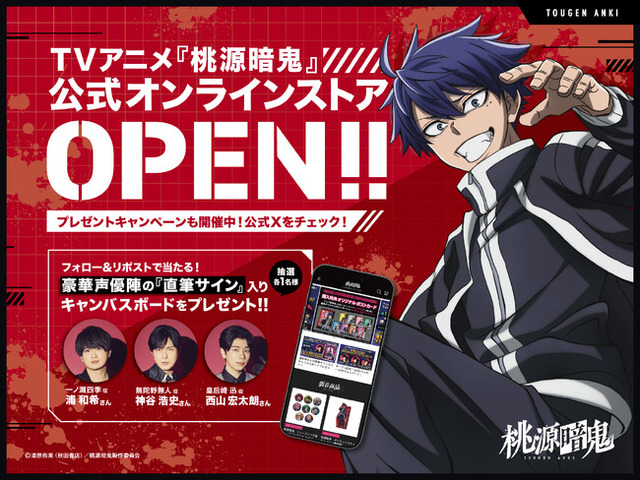 TVアニメ『桃源暗鬼』の公式オンラインストアオープンを記念して、出演キャストの直筆サイン入りキャンバスボードが当たるプレゼントキャンペーンを開催いたします。