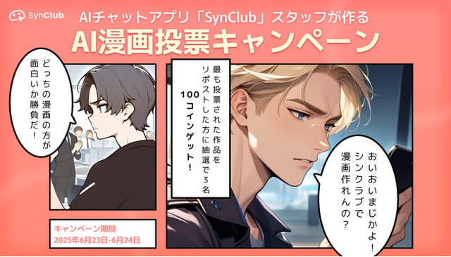 HiClub株式会社(本社:東京都港区、代表取締役社長:古谷由宇)が提供する、 AIチャット&友達作りができる対話型AIアプリ「SynClub」(シンクラブ)(iOS、Android版)は、運営スタッフが作成した漫画作品を投票するキャンペーンを開始いたしました。本キャンペーンでは、新機能「AI漫画作成ツール」の画像生成を用いて作成された公式作品をXで公開し、多く投票された作品にシェアをした方の中から抽選で、「SynClubコイン」をプレゼントいたします。