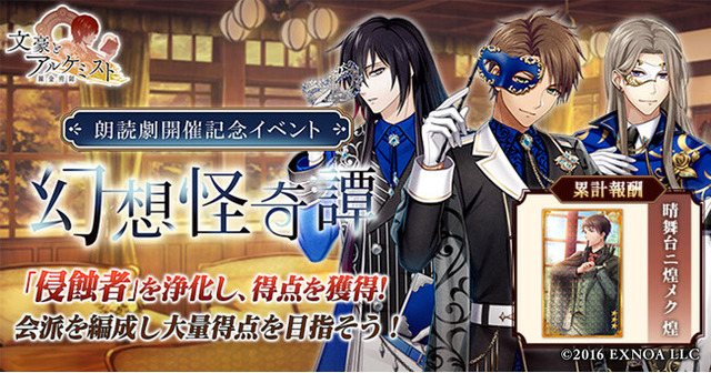 合同会社EXNOA(本社:東京都港区、CEO:村中 悠介、URL:https://games.dmm.com/)が運営するDMM GAMESは、6月23日(月)より、女性向け文豪転生シミュレーションゲーム「文豪とアルケミスト」において、イベント『朗読劇開催記念イベント「幻想怪奇譚」』と限定召装『朗読劇開催記念イベント「幻想怪奇譚」』を開始いたしました。