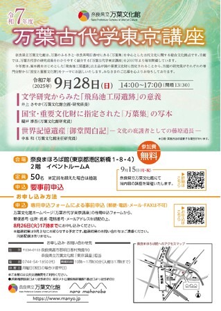 万葉文化館ホームページ「万葉古代学東京講座」の専用申込フォームから、郵便番号・住所・氏名・
