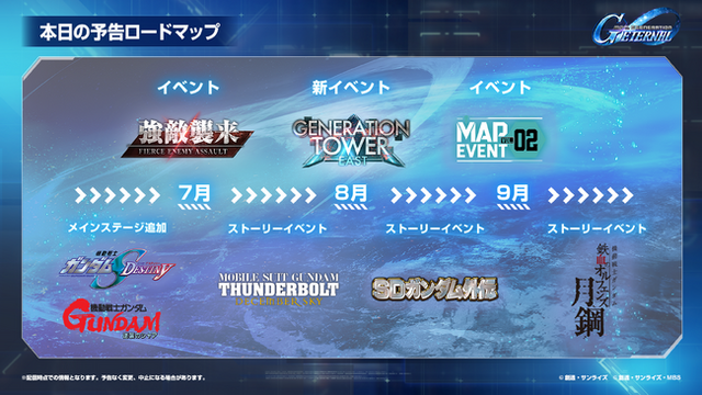 7月以降のストーリーイベントとして「機動戦士ガンダムTHUNDERBOLT DECEMBER SKY」、「SDガンダム外伝 ジークジオン編」、「機動戦士ガンダム鉄血のオルフェンズ 月鋼」が追加予定です。さらなる続報をお待ちください!