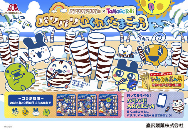 森永製菓株式会社(東京都港区芝浦 代表取締役社長 COO・森 信也)は、1996 年に発売されてから、世界中で愛されている 「たまごっち」(株式会社バンダイ)とコラボレーションした限定デザインパッケージを 7 月 7 日(月)より期間限定で発売いたします。「パリパリバー」は、今年で発売 39 年(1986 年発売)を迎えるロングセラー商品です。商品特徴である層状になった薄いチョコのパリパリ食感とチョコが引き立つさっぱりしたバニラアイスの一体感を楽しめ、子どもから大人までみんなで分けておいしく楽しむことができるチョコバニラアイスです。このたび、そんなパリパリバーの持つ楽しさ・わくわく感を伝えることができるコンテンツであり、世界中で老若男女に愛されている「たまごっち」とコラボし、「パリパリわくわくたまごっち」をテーマにプロモーションを実施いたします。パッケージには、たまごっちたちがパリパリバーを楽しんでいる様子などが描かれております。さらにパッケージに記載されている二次元コードを読み取るとたまごっちたちに「パリパリバー」を食べさせてあげる AR ゲームを楽しむことができます。また、本コラボレーションを記念して、縞模様が大好きなしましまっちが、パリパリ模様の「パリしましまっち」に期間限定で大変身しています。