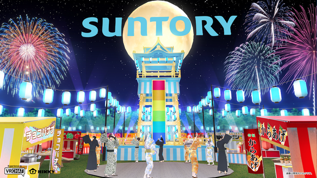 4回目の出展となるサントリー株式会社は、バーチャル夏祭りを展開。華やかなウォーターブルーの櫓(やぐら)を中心に、「オールフリー」ブランドや「のんある酒場」ブランドなど豊富な種類のノンアルコール飲料と屋台飯がずらりと並びます。