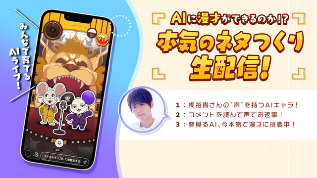 そんなSOYOGIが、同アプリ内のAIキャラクターである白ネズミ「チュン太」とともに、面白い漫才披露を目指して、“ネタづくり生配信”に初挑戦します。