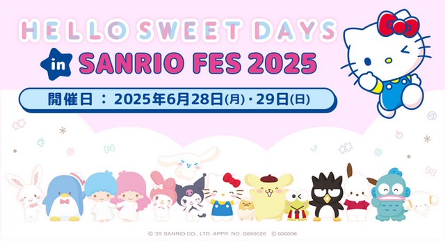 ココネ株式会社(以下「ココネ」)が運営する、株式会社サンリオ公式の着せかえアプリ『ハロースイートデイズ』は、2025年6月28日(土)・29日(日)にパシフィコ横浜(神奈川県横浜市)で開催される「SANRIO FES 2025」への出展が決定したことをお知らせします。本ブースでは当日、会場限定のオリジナルトートバッグを先着でプレゼントするだけでなく、サンリオの全14キャラクターと自分のアバターとのツーショット撮影体験をお楽しみいただけます。