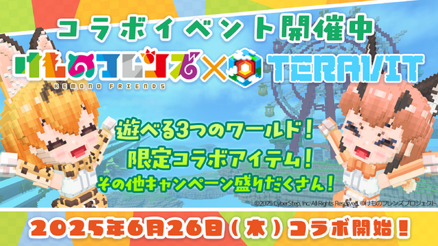 サイバーステップ株式会社が開発運営するサンドボックスゲーム『テラビット』にて、Age Global Networks株式会社が主幹事を務める『けものフレンズプロジェクト』とのコラボイベントを2025年6月26日(木)のアップデート後から開催することをお知らせします。
