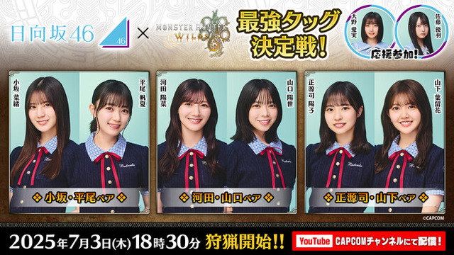 「日向坂46」メンバーの小坂菜緒、河田陽菜、山口陽世、正源司陽子、平尾帆夏、山下葉留花が2人1組となり、『モンスターハンターワイルズ』最強タッグの座をかけて狩りに挑む!