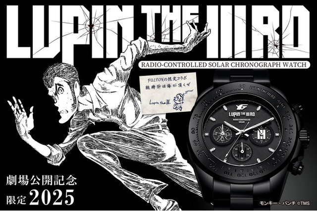 こだわりのブラックボディスイスで創業140年を誇る老舗メーカー「FULTON」から劇場公開記念として限定2025本のみ生産されたコラボ腕時計が発表。モンキー・パンチの原作に漂うアダルトかつ危険なテイストの世界を引き継ぎ、ハードで危険な香り漂う『LUPIN THE IIIRD』の 世界観を腕時計に落とし込んだモノクロながらもハードボイルドでスタイリッシュなテイストを表現。ファンならずとも1本は欲しい逸品に仕上がっている。
