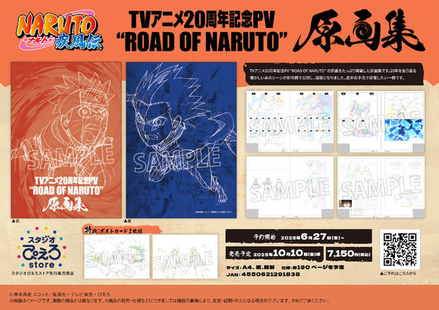 アニメ『NARUTO-ナルト- 疾風伝』より、新商品情報!TVアニメ20周年記念の際に公開されたPV ROAD OF NARUTO”の原画をたっぷり掲載した原画集の登場です!約190ページ(予定)の大ボリュームで原画を堪能いただけます。こちらの商品は2025年10月頃、アニメ制作会社「ぴえろ」の公式通販サイト「スタジオぴえろストア」にて先行発売!本日より「スタジオぴえろストア」他、通販サイトでご予約受付中!
