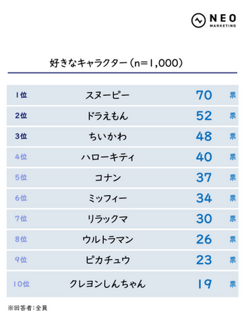 1位は70票でスヌーピーでした。昭和期に定着した海外キャラが令和の今も首位に立つ事実から、世代や国境を超えた「普遍性」が購買・コラボの安心材料になると読み取れます。