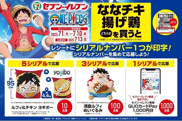 期間中にセブン‐イレブン店舗で、ななチキ・揚げ鶏(フランク店舗ではスパイスチキン・スパイスチキンレッドどちらか)を買うと、レシートにシリアルナンバー1つが印字されます。シリアルナンバーを集めて応募すると、限定描き下ろしデザインのセブン‐イレブン専用QUOカードPay1,000円分などのONE PIECEオリジナルグッズが抽選で合計1,110名様にプレゼントされます。