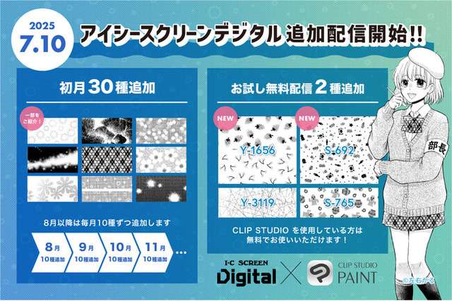 漫画画材ブランド「アイシー」を製造・販売する株式会社G-Too(本社:東京都港区、代表取締役社長:石井 剛太)は、株式会社セルシスのイラスト・マンガ・Webtoon・アニメーション制作アプリ「CLIP STUDIO PAINT」で利用可能な、人気のスクリーン素材「アイシースクリーンデジタル」新種の柄の定期配信を、2025年7月10日より開始いたします。