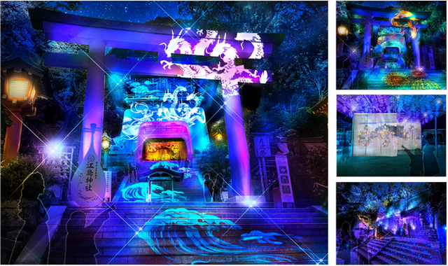 7月27日(日)からの第2期では、瑞心門から“光の導き”を煌めきで表現した石段を昇りきった辺津宮において、本殿へ向かう通路にかかる葦簀(よしず)の下で貝細工の風鈴が涼やかな音を鳴らす中、羽衣のようなゆらめく布に江の島を舞台とした浮世絵の作品たちが映し出されます。いにしえからこの地の文化を育んできた江の島の魅力を表現する、幻想的な空間を体験いただけます。