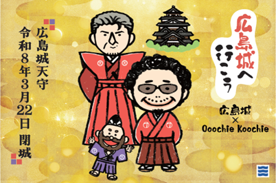 7月12日(土)広島グリーンアリーナでの公演から全国ツアーがスタートする 奥田民生・吉川晃司の ユニット Ooochie Koochie(オーチーコーチー) の大型イラストが、広島グリーンアリーナ近く、広島城三の丸に登場します。大型イラストは、Ooochie Koochieの2人が、広島城天守を前に赤い着物を羽織ったもので、来年3月22日に閉場が決まり入城ラストイヤーとなっている広島城天守閣への 訪問を呼びかけています。