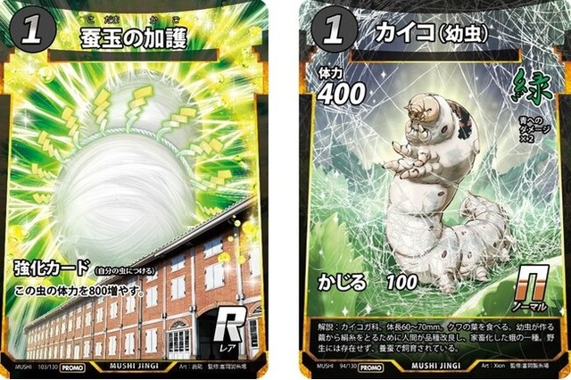 この度の「蚕蟲祭 - 蟲神器 富岡製糸場ノ陣」は、2025年3月に開催された「蟲神器 人気虫投票」で、「カイコ(成虫)」が1位に選ばれたことをきっかけに実現することになりました。初心者から楽しめる体験会(7月26・27日)のほか、カードを使ったバトル大会(8月16・17日)を行います。期間中にご来場された方には、本イベントでしか手に入らない「蚕玉の加護」と「カイコ(幼虫)」のカードをプレゼントするほか、蟲神器カードを模した顔出しパネルも設置します。