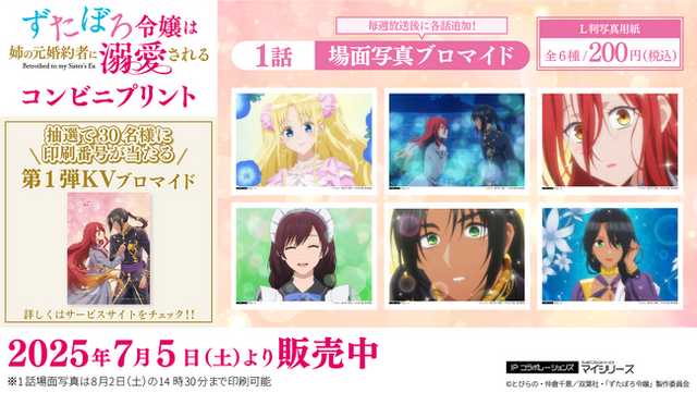 夏アニメで話題沸騰中の「ずたぼろ令嬢は姉の元婚約者に溺愛される」コンビニプリントに「場面写真」をプリントできるサービスが追加されました。