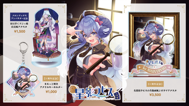 今回の新商品は、活動3周年を記念した“名探偵ラピス”シリーズと、メロンブックスアンバサダー就任を記念した“ドジっ娘店員ラピス”のアクリルスタンド。