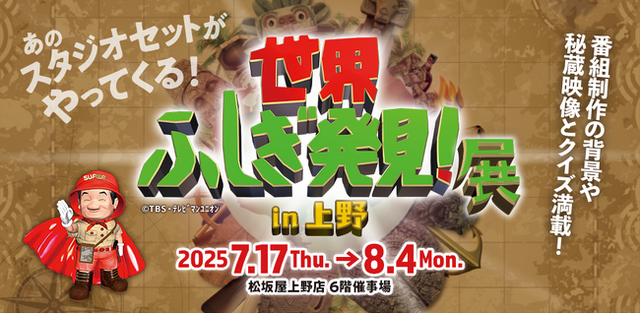 あのスタジオセットがやってくる!7/17(木)~8/4(月)、大人気テレビ番組『世界ふしぎ発見!』(TBSテレビ)が展覧会になった「世界ふしぎ発見!展 in 上野」を松坂屋上野店で開催いたします。1986年から約1700回続く人気番組の貴重映像や出演者と制作者の完全撮り下ろしインタビュー映像を満載し、世界中から収集したふしぎなモノも興味深いエピソードやクイズと共に展示します。そして、番組内ではおなじみの『ボッシュート!』体験ができるスタジオセットを特別展示いたします!