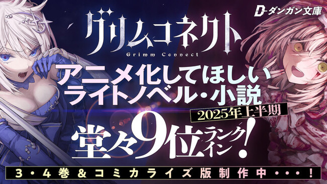 株式会社イードが運営するメディア『アニメ!アニメ!』(https://animeanime.jp/)にて毎年二回実施される読者アンケート『アニメ化してほしいライトノベル・小説は?(2025年上半期)』にて、株式会社BookBaseが運営するダンガン文庫の作品である『グリムコネクト』(著:十利ハレ)が堂々の9位を獲得いたしました。