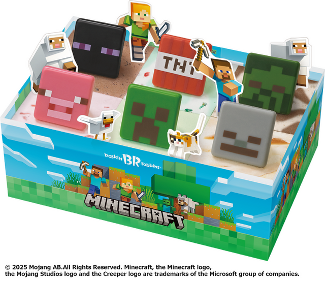 B‐R サーティワン アイスクリーム株式会社(所在:東京都品川区上大崎3-1-1/代表取締役会長兼社長 CEO ジョン・キム:東京証券取引所(スタンダード市場):2268)は、2025年7月17日(木)から「マインクラフト アイスクリームケーキ」を発売します。 史上最も売れたゲームの一つであるMinecraftは、5月17日に16周年を迎え、世界中のファンに愛され続けています。そして今年、初の実写映画も公開された大人気ゲーム「Minecraft (マインクラフト)」が、初めてサーティワンにやってきます!人気キャラクターの四角いチョコプレートがのった四角いケーキピースが6コ合わさった、四角だけのアイスクリームケーキは、マインクラフトのプレイヤーが最初に降り立った世界をそのままイメージしました。チョコレートは、プレイヤーに近づき爆発する「クリーパー」、見た目がなんともキュートな「ブタ」、目が合うと襲ってくる「エンダーマン」、爆弾の「TNT」、夜や暗い場所に現れる「ゾンビ」、遠くから矢を放つ「スケルトン」が大集合!それぞれのキャラクターの雰囲気やカラーに合わせたフレーバーは、人気のポッピングシャワーをはじめ、お子様から大人までみんなが好きなフレーバーをセレクトしました。別添のピックを自由に飾って、みんなでわいわいマイクラの世界を楽しみましょう!