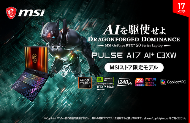 ・Pulse A17 AI+ C3XW シリーズ製品ページ:https://jp.msi.com/Laptop/Pulse-A17-AI-Plus-C3XWX