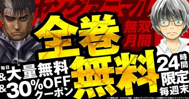 「ヤングアニマル」は1992年に創刊された白泉社が発行する青年漫画雑誌です。この度、「ヤングアニマル」内の対象作品を24時間限定で全巻無料公開するほか、Xで対象の投稿をリポストした方に抽選でシーモアポイントをプレゼントするなどの、コミックシーモア限定の豪華キャンペーンを実施いたします。アニメ化や実写映画化でも話題を呼んだ「3月のライオン」、剣と魔法の世界を舞台に描かれるダーク・ファンタジー「ベルセルク」、日本のみならず韓国でのドラマ化も果たした格闘漫画「ホーリーランド」など、コミックシーモアでも根強い人気を誇る「ヤングアニマル」の人気作品をこの機会にお得にお楽しみいただけるチャンスです。