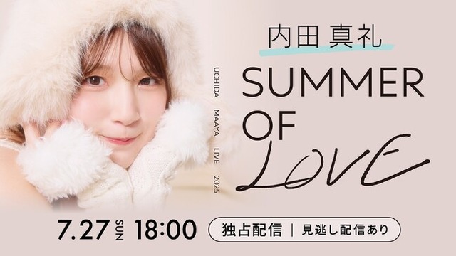 2012年に本格的な声優デビューを果たし、「中二病でも恋がしたい!」の小鳥遊六花役をはじめ、「アイドルマスター シンデレラガールズ」、「約束のネバーランド」、など、数々の話題作に出演。声優として大きく飛躍する一方で、2014年にはアーティストとしてメジャーデビューし、ライブツアーやフェス出演も精力的にこなし、これまでに10枚以上のシングルと複数のアルバムをリリース。ポップス、ロック、バラードなど多彩な楽曲を通じて、“歌う表現者”として幅広い層からの支持を集める内田真礼は昨年にアーティストデビュー10周年を迎え、さらなる飛躍が期待されています。そんな中、2017年の「UCHIDA MAAYA LIVE 2017 +INTERSECT(ハート)SUMMER」以来、実に約8年ぶりに東京・日比谷野外大音楽堂でのライブが決定いたしました。さらにオンライン動画配信サービスHuluでは、2025年7月27日(日)に開催するライブ「UCHIDA MAAYA LIVE 2025 SUMMER OF LOVE」の模様を独占生配信いたします。またライブ配信後には見逃し配信も実施いたします。都心の空の下、特別な場所で行われる一夜限りの公演をHuluで何度でもお楽しみください。